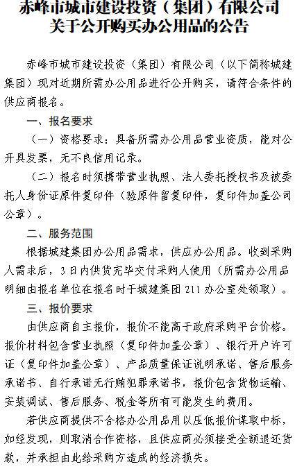 赤峰市城市建設投資(集團)有限公司 關于公開購買辦公用品的公告