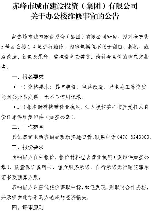 赤峰市城市建設投資(集團)有限公司 關于辦公樓維修事宜的公告