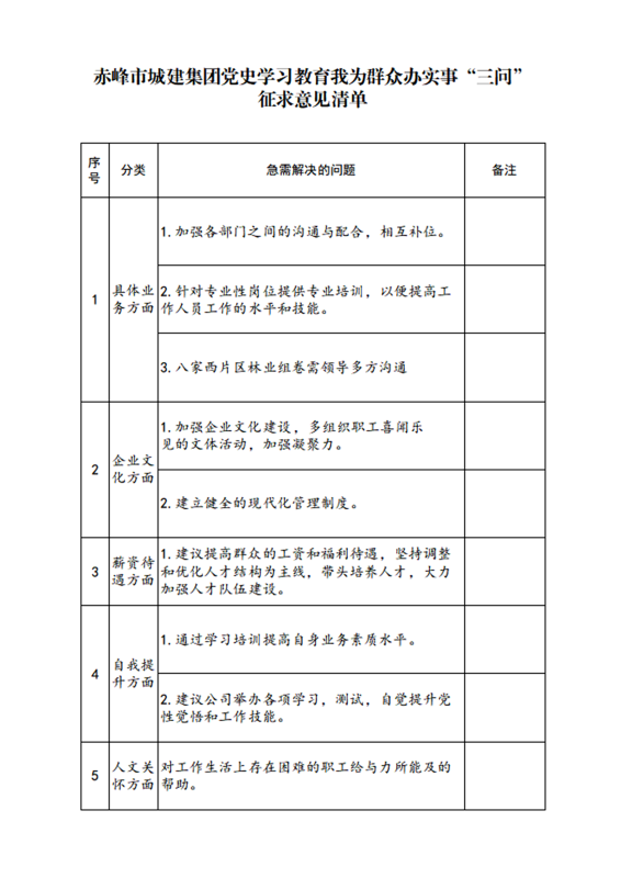 赤峰市城建集團黨史學習教育我為群眾辦實事“三問” 征求意見清單